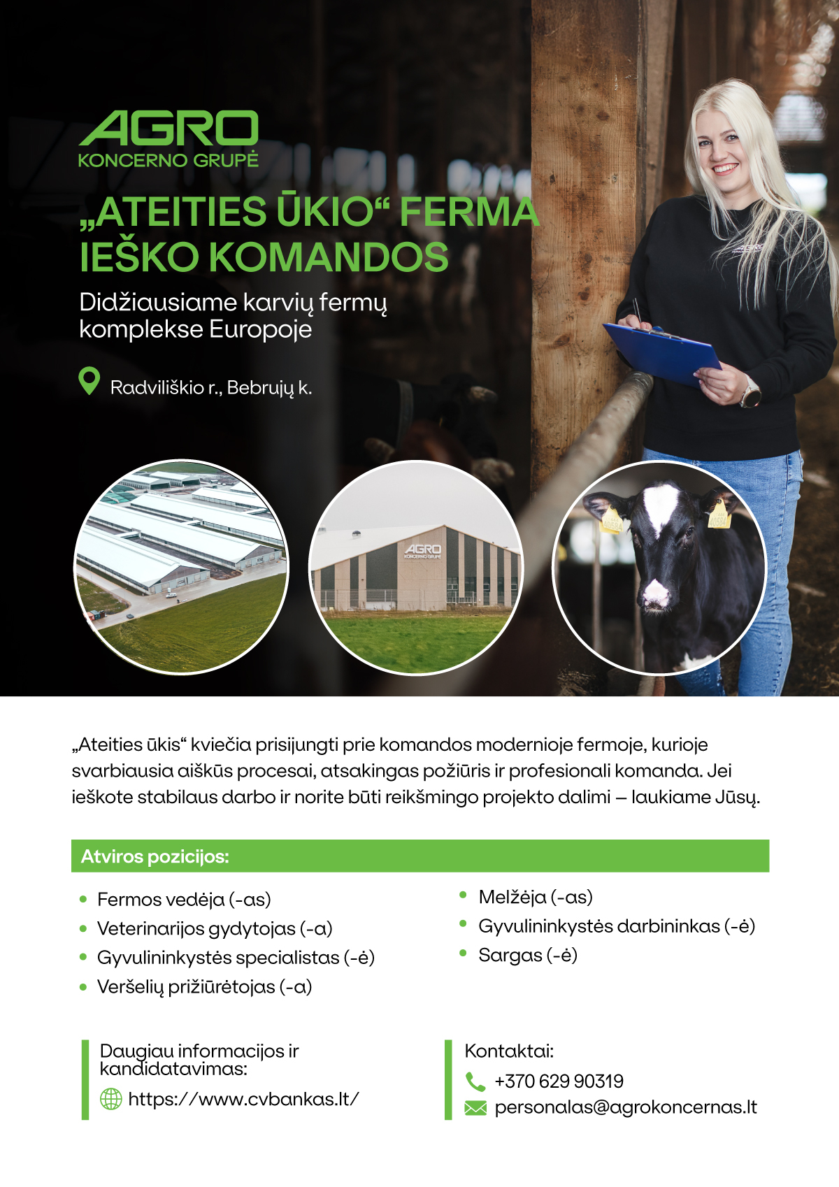 UAB „Ateities ūkis“ kviečia prisijungti prie komandos didžiausiame karvių fermų komplekse Europoje, įsikūrusiame Radviliškio rajone, Bebrujų kaime. Šiuolaikiškoje fermoje kuriame darbo aplinką, kurioje svarbiausia aiškūs procesai, atsakomybė ir stipri komanda.