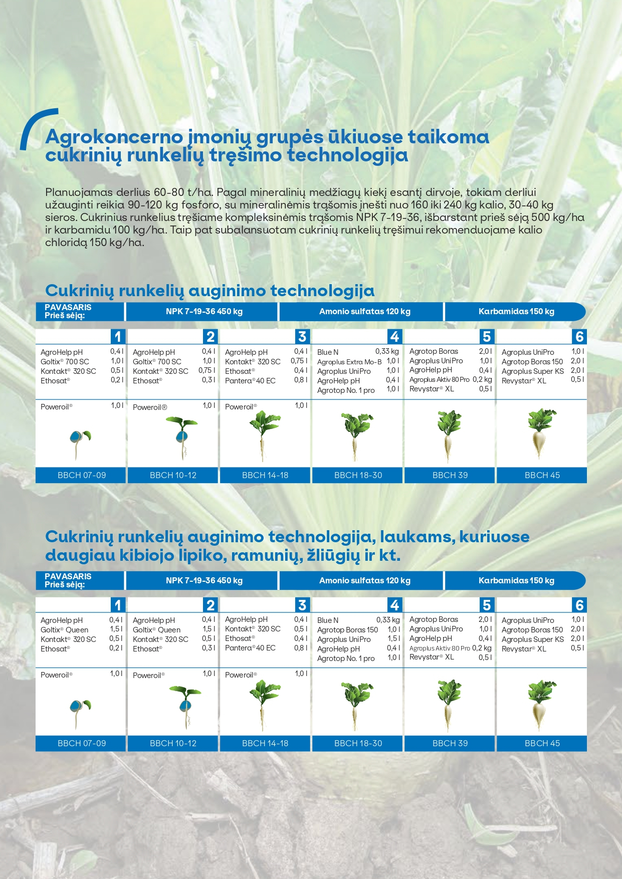 Taip pat pateikiama „Agrokoncerno“ įmonių grupės ūkiuose patikrinta auginimo ir tręšimo technologija, padedanti pasiekti 60–80 t/ha derlių bei efektyviai valdyti piktžoles.