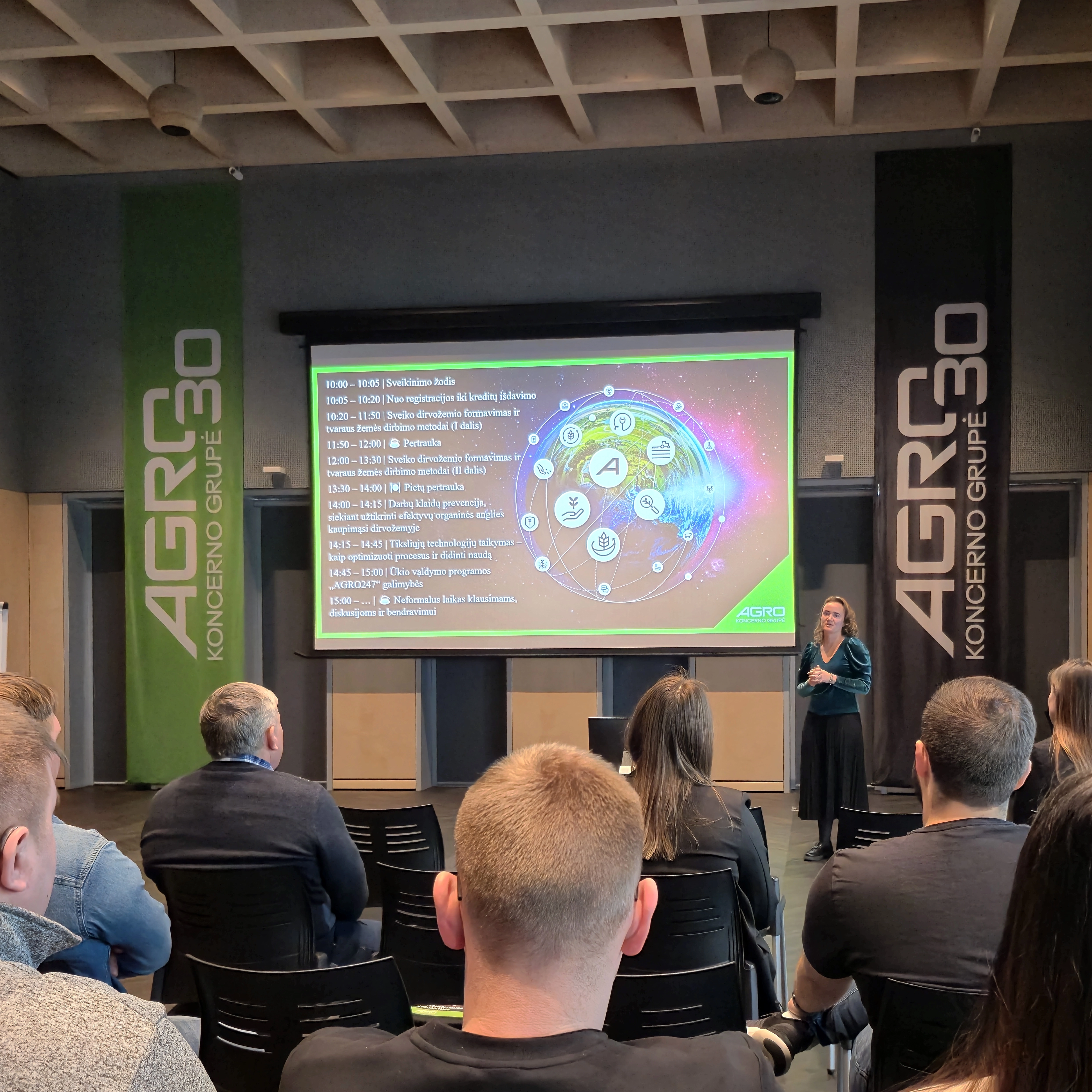 Po įžanginės kalbos „Agrokoncerno“ tvarumo ir inovacijų skyriaus vadovė dr. Miglė Jakučionytė-Skodienė pristatė mokymų tikslus bei programos reikšmę tvaraus ūkininkavimo kontekste. Ji akcentavo, kad anglies kreditų programa – ne vien finansinė paskata, bet ir sisteminis požiūris į tvarų ūkininkavimą, kuris yra pagrįstas mokslu ir praktinėmis žiniomis.