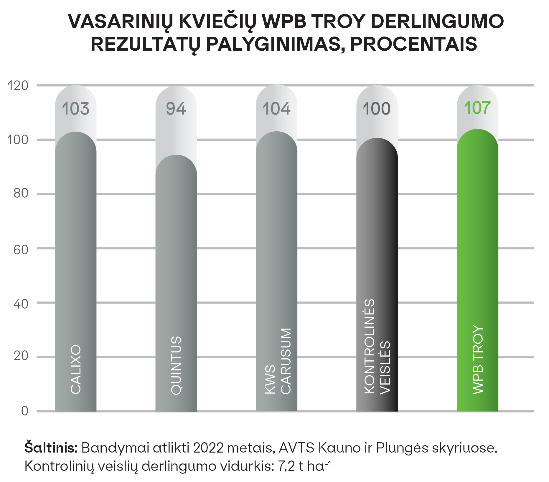 Vasarinių kviečių WPB Troy derlingumo rezultatų palyginimas, proc.